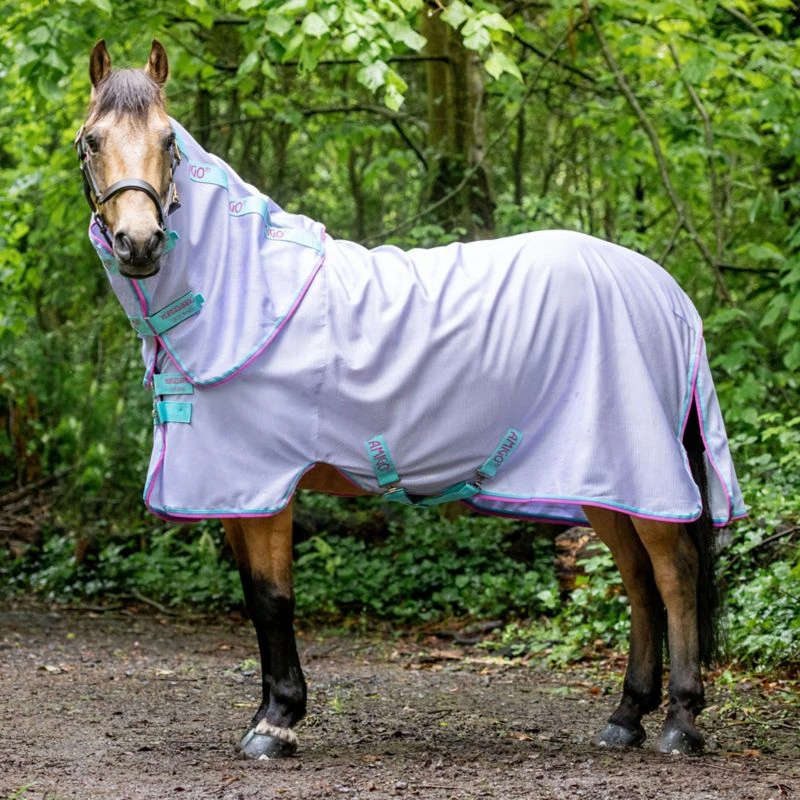 Excellent value protection. The knitted polyester fabric is soft, absorbent and strong with sun reflecting properties. Front Dual Leg Arches, Classic Front closure, silky tail, shoulder and mane lining, cross surcingles, removable neck cover and silver color to reflect sunlight.