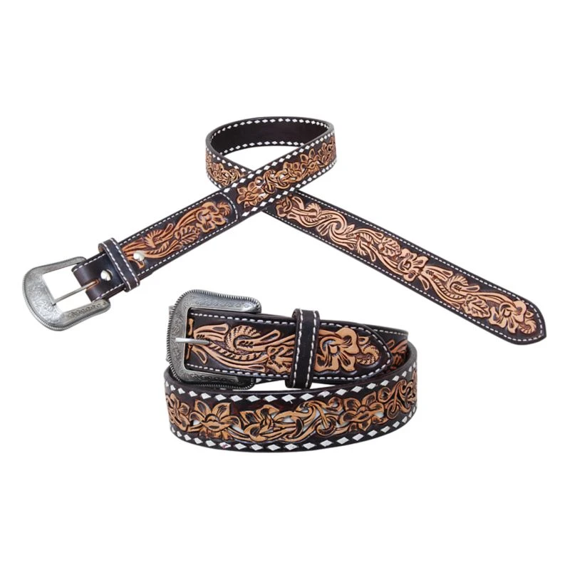 If you are looking for that perfect finishing touch? Let Circle Y finish off your outfit with this stylish belt, perfect for any occasion or season! From classic floral tooling to a white buck stitched edge, you will show up sharp at every event with this belt around your waist. Measures 1 1/2″ wide with a silver etched removable buckle. Available in sizes from 26″-44″.