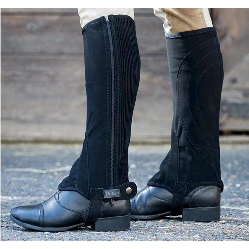 Made of synthetic suede for lasting durablility. Features a ribbed elastic calf for expandable comfort. YKK side zip entry with bottom snap over closure.