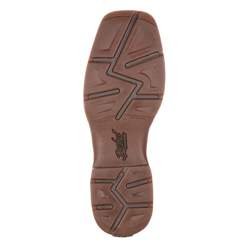 The molded EVA midsole is lightweight and flexible, and the outsole is slip, oil and abrasion resistant rubber. The double row sole stitch around the square toe provides durability and the 1 ½” rocker heel helps promote a natural heel strike.