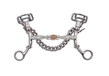 Lynn McKenzie Signature Series Stainless Steel MMB Short Shank – 5” Shank with Sweet Iron Comfort Snaffle with Copper Roller (MB 03, Level 1) Copper Inlay Mouth 5”. This mouthpiece is made of polished Sweet Iron which naturally oxidizes or rusts. Harmless to horses, it has a sweet taste and promotes salivation.