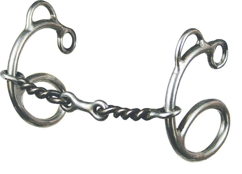 This bit is a great alternative to the traditional ring bit. Its creative design offers direct control for suppling and head set. The sweet six works off the corners of the lips, tongue, and bars. The curb design allows an additional pressure area for control and education. Best used in the training process with split reins and chain curb (not included). This bit can be complemented with a running or German martingale. Adjust to a neutral position with one wrinkle in the corner of the mouth. 3″ Cheeks. 5 1/2″ Mouth. 3/8″ Sweet iron twisted dogbone.