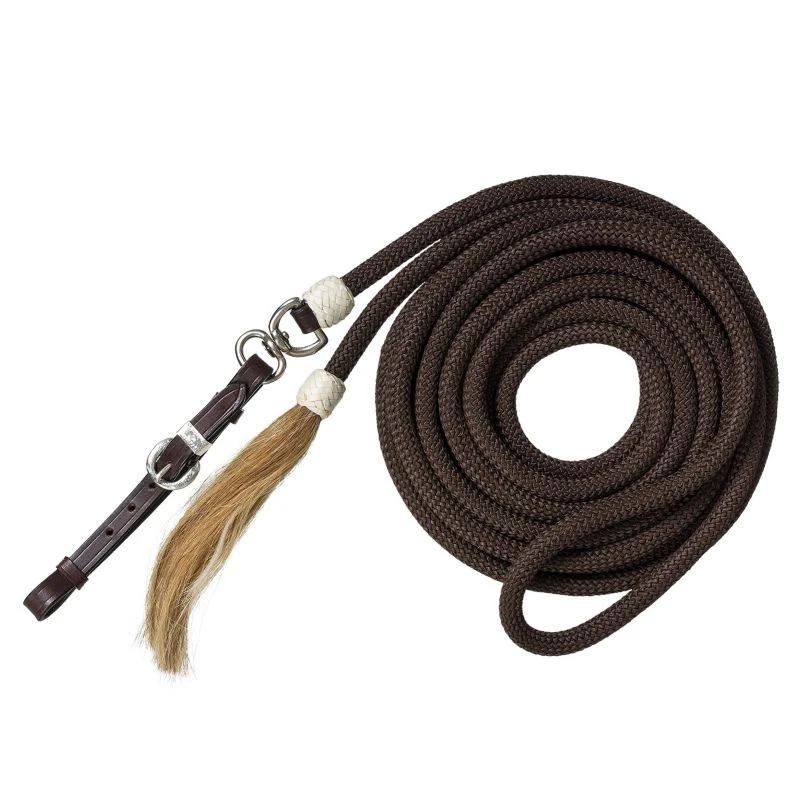 1/2″ braided nylon cord with engraved silver buckle/keeper and horse hair tassel. 22′ long.