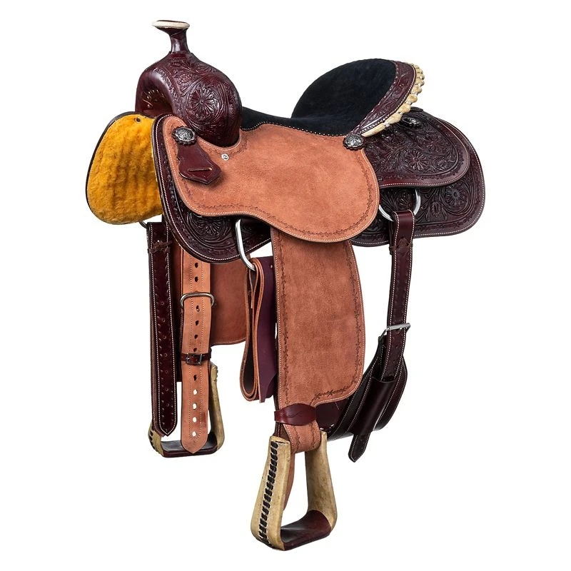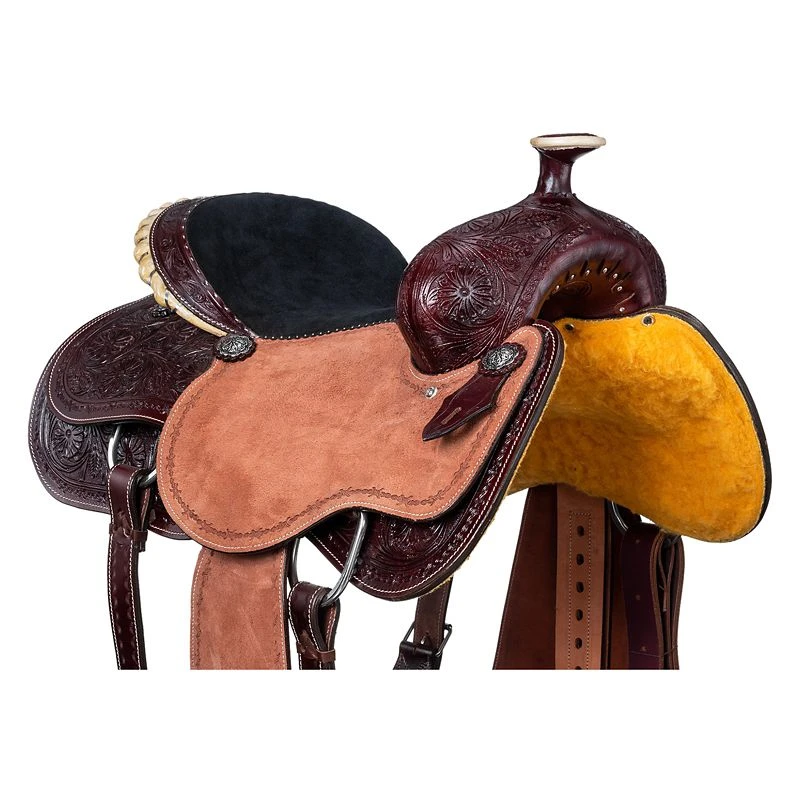 Form and function, this saddle is the perfect combination. Built on a strong rawhide-wrapped fiberglass tree, this saddle is reliable for ranch work or pleasure riding. Its double skirt features intricate floral and leaf tooled designs with a rich mahogany finish. The roughout jockeys and fenders, with barbwire edge detailing, provide the correct amount of grip when riding. A flat short horn and wide leather laced rawhide stirrups are musts for any working cowboy. Complete with Tough1 quick change stirrup buckles, rawhide cantle with stainless steel wrap, and attractive rounded skirt. Package includes browband headstall, cotton roping reins, wool blend saddle blanket, and a girth.