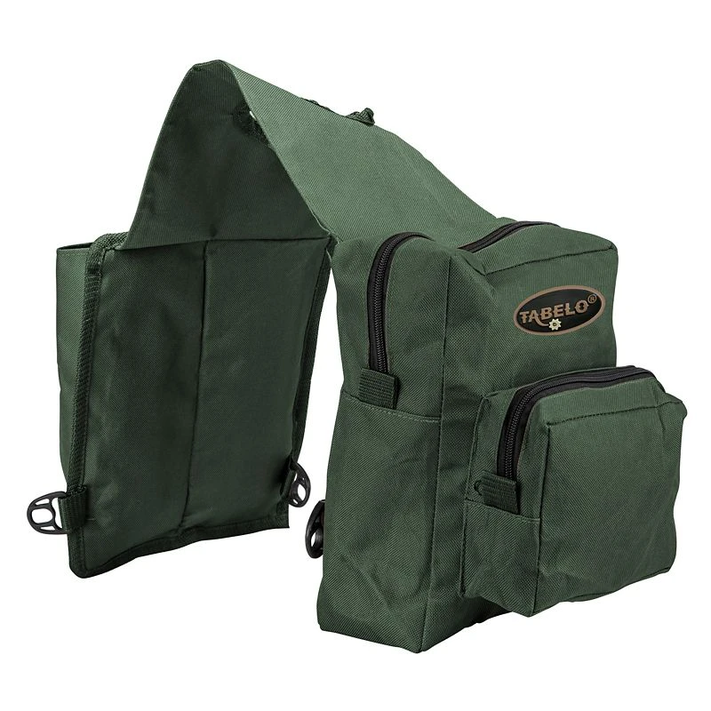 Made of 600 denier material, it features an insulated pouch perfect for drinks or snacks on one side, plus a bonus smaller zip compartment perfect for smaller items. The other side has two vertical pouches perfect for carrying drinks or other slender items. The reinforced horn hole is effortless to use, and it features additional plastic dees for further attachment.