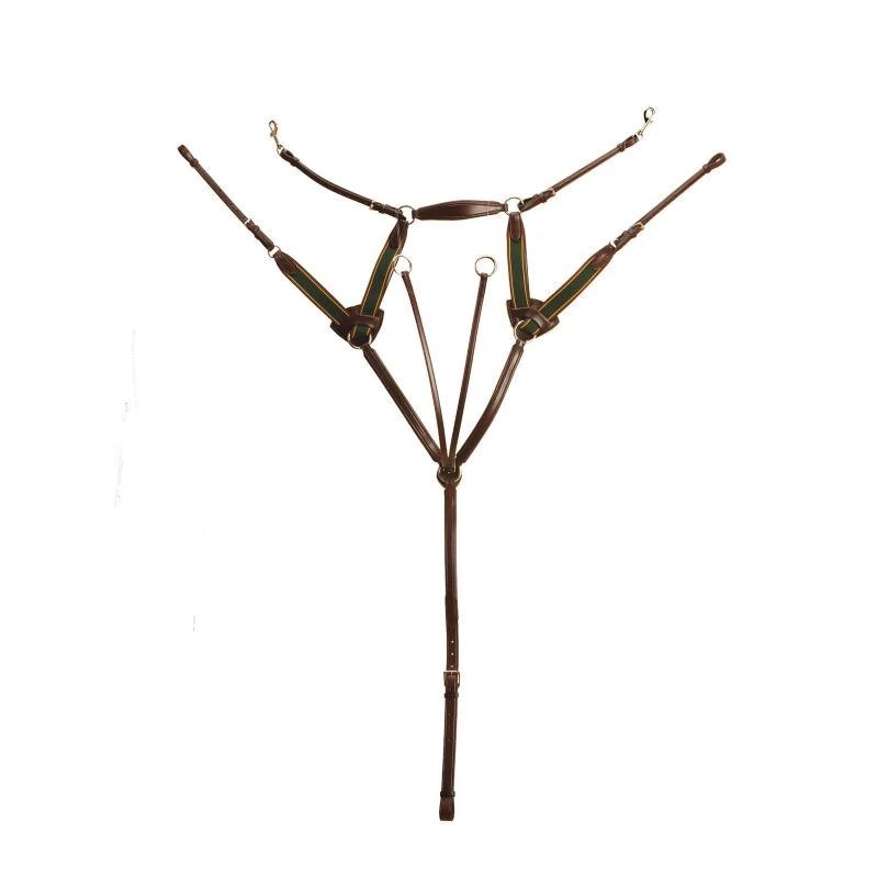 The five points of attachment help to distribute the pressure and the heavy elastic gives added freedom to the shoulders. The attachment straps are adjustable with running attachment included. 5 points of attachment are two on each sides of the girth, and one on the girth between the legs, and 2 D-Ring attachments on each side of saddle.