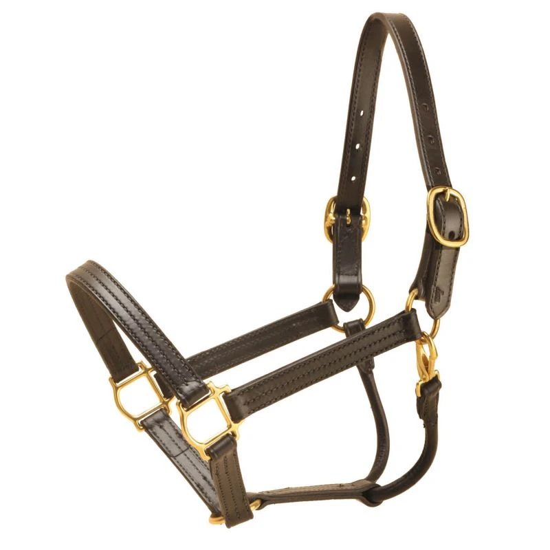 Premium quality 1″ English bridle leather with wide wheat triple stitching. This halter has a rolled snap throat, fixed nose, and adjustable crown. Solid brass hardware.