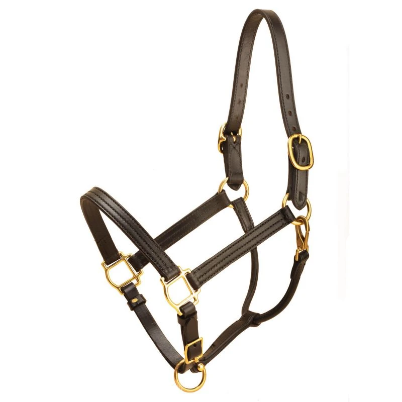 Premium quality 1″ double-ply English bridle leather, triple-stitched and reinforced at stress points. Adjustable nose and crown (at both sides). Rolled leather throat with snap. Solid brass hardware.