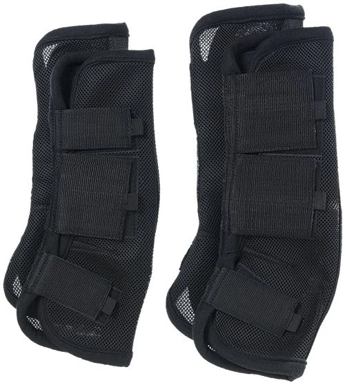 Durable comfort mesh fly boots protect legs from biting insects and provide UV protection to the lower leg. Large “quick grip” closures make for easy on/off. Lower straps have elastic to provide comfort allowing the boot to move with your horse. A flexible spine provides support to keep the boot upright while a neoprene roll, located above the joint, keeps boot from collapsing as the horse moves. Set of 4.