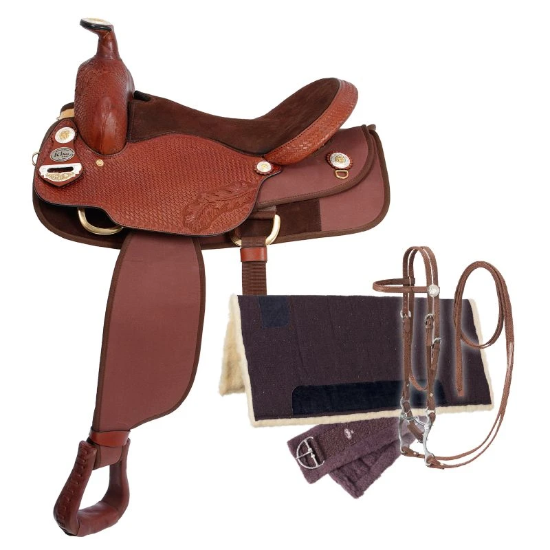 Package includes saddle; matching nylon bridle (complete with bit and curb) and reins with leather overlay; Ottawa fleece bottom acrylic blend saddle pad; and fleece lined girth.