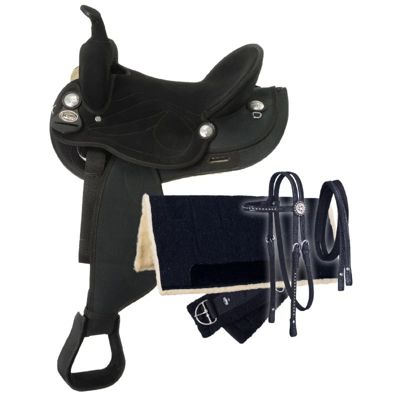 Deluxe Package includes saddle; matching nylon headstall and reins with leather overlay and dot embellishments; saddle pad with fleece bottom; and a fleece lined cinch.