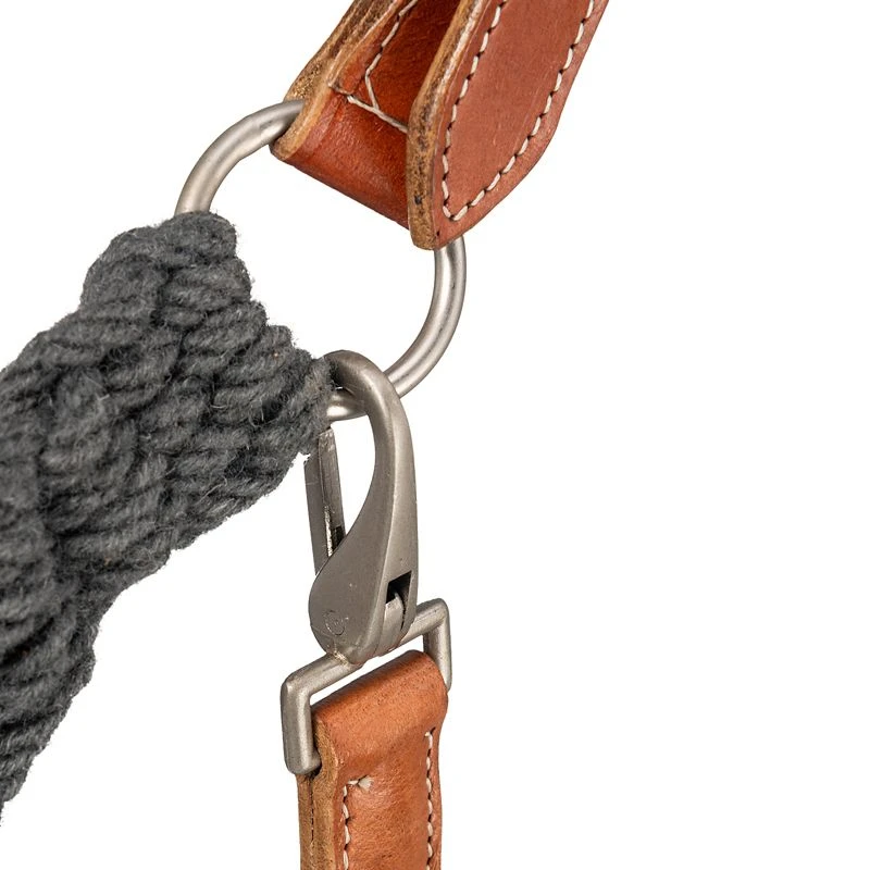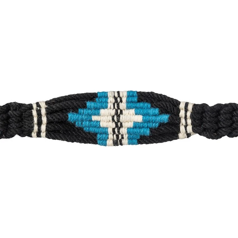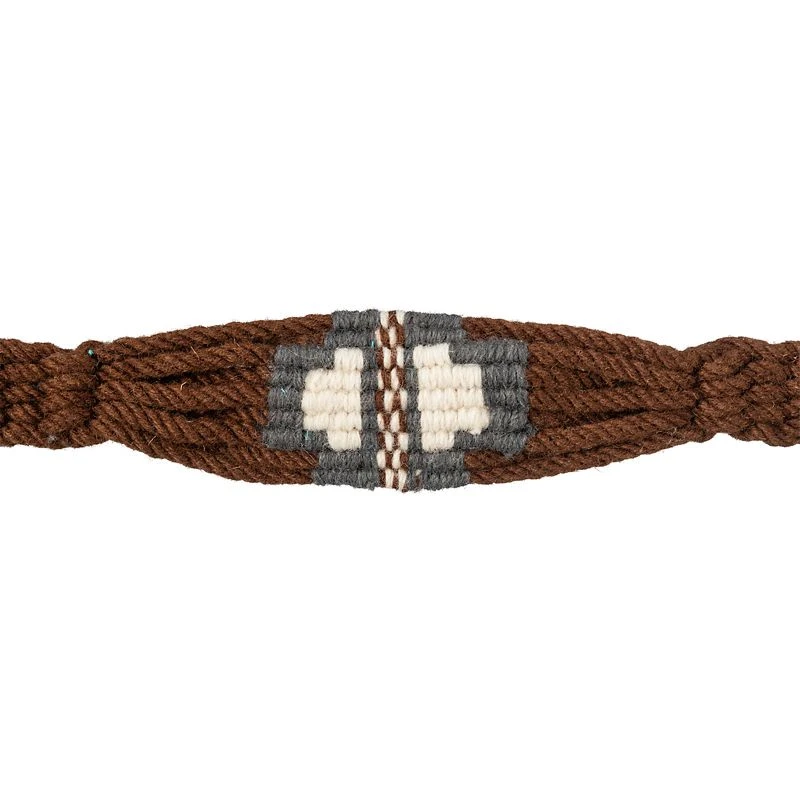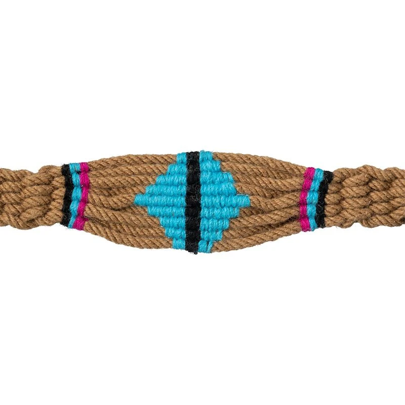 Uniquely western, this leather halter is doubled and stitched for excellent strength. The cheeks and nosepiece are made of hand twisted wool string in a variety of bold color combinations and patterns. Buckle under chin and on both sides of crown piece for simple fit adjustments. Brushed nickel hardware.