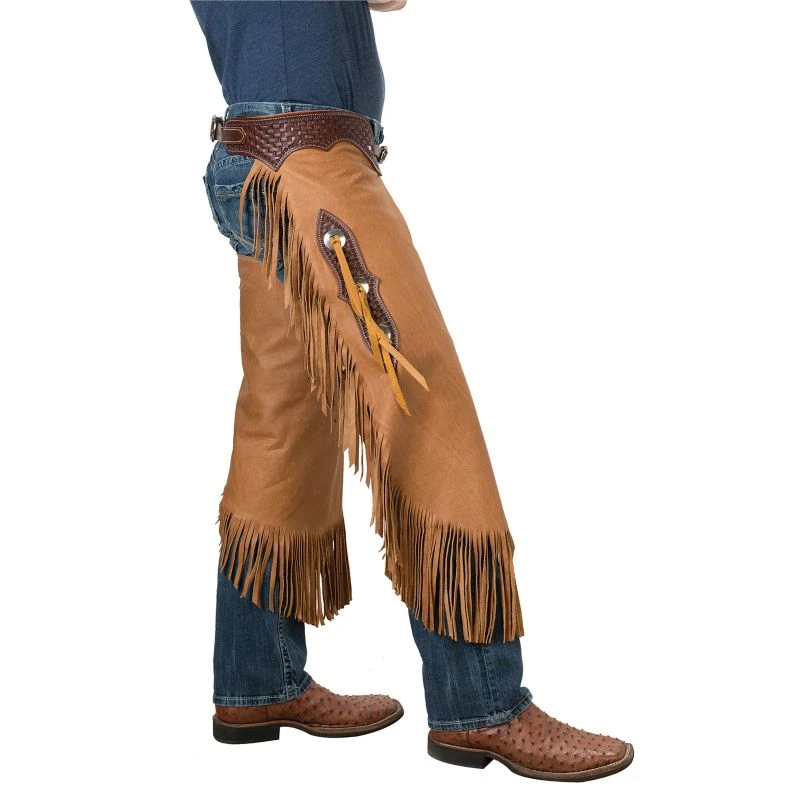 Handcrafted by our skilled craftspeople, these chinks feature a versatile design with a few extra details. Belt-style front closure for easy on and off. Chrome tanned top grain leather chinks feature a basket weave tooled yoke and leg scallops. Stainless steel conchos with ties on both chinks. Chinks are great for protecting legs from thick brush, weather, ropes and more. With the added details these chinks can be worn for everyday ranch work, trail riding or accent your arena style.