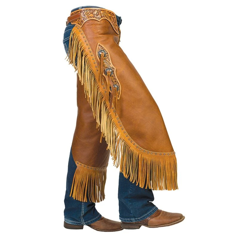 High end fashion styling sets these chinks apart from the rest! Handcrafted from chrome tanned pull-up leather in rich golden tones, these chinks feature details that turn heads including floral tooled yoke and scallop set, floral conchos with black accents, and sewn-on contrasting fringe outlined with antique silver umbrella spots. Designed for added freedom of movement, they feature adjustable leg straps, back buckle closures and front tie closures to keep these chinks in place.