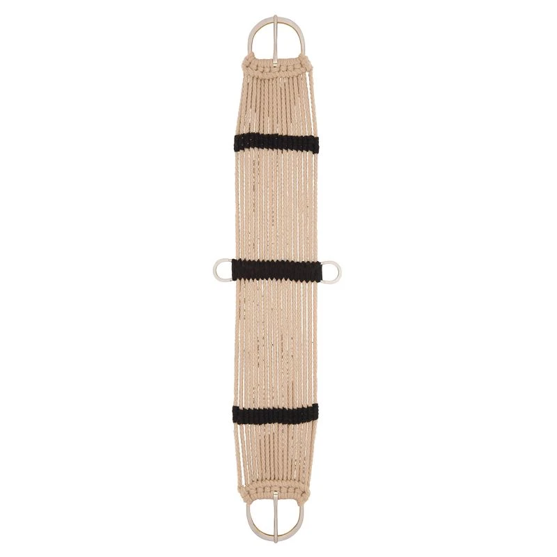 This rayon cinch is a traditional favorite great for all riding needs. Features woven-in dees for tie down strap and back cinch attachment. Durable nickel plated hardware. White with brown accents. Horse size.